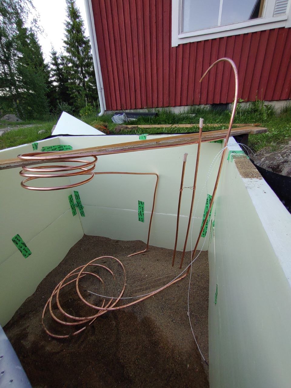 Alle tuli 15cm hiekkaa. Päälle käyttövesikierukka varulta tulevalle patterilämmitykselle sekä suihkun käyttövesikierukka. Kierukat on muotoiltu hyödyntäen ideaa että lämpöenergia pyritään pitämään keskellä ja kaikki otettava lämpö otetaan reunoilta jotta lämpötilaero olisi mahdollisimman pieni ulkopuolelle ja sitä kautta lämpöhäviö. Kylmä vesi ensiksi viilentää hiekkakasan pohjaa ja tämän jälkeen kuumenee aivan pinnasta, jättäen keskustan kuumaksi.